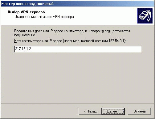 - Указываем VPN-сервер (имя или IP-адрес; в данном примере — 217.15.1.2; рис. 10.27):