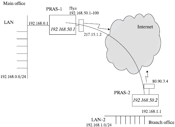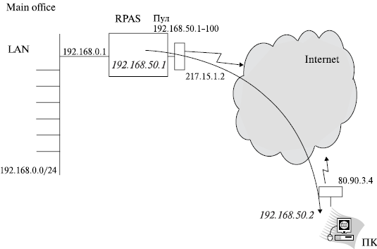 Между ПК мобильного пользователя и сервером удаленного доступа будет установлен защищенный "виртуальный" канал, клиентский ПК получит IP-адрес из пула адресов сервера RRAS (таким образом будет решена задача маршрутизации IP-пакетов между клиентом и корпоративной сетью), все пакеты, передаваемые между клиентом корпоративной сетью, будут шифроваться.