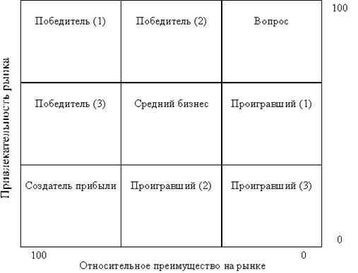 В центре внимания модели GE/McKinsey находится будущая прибыль или будущая отдача капиталовложений, которые могут быть получены организациями. Другими словами, основной упор сделан на то, чтобы проанализировать, какое влияние на прибыль могут оказать дополнительные инвестиции в конкретный вид бизнеса в краткосрочной перспективе. Анализируемые виды бизнеса отображаются на сетке матрицы в виде кружков, или "пузырьков", центры которых однозначно задаются оценками привлекательности рынка (ось У) и относительного преимущества организации на рынке (ось X). Каждый кружок соответствует общему объему продаж на некотором рынке, а доля бизнеса организации в этом объеме продаж показывается сегментом в этом кружке.