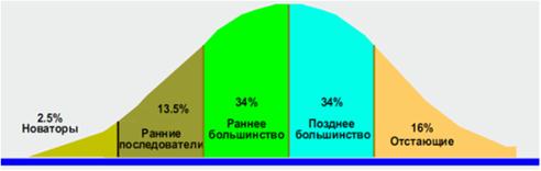 Э.Роджерс исследовал «уровни принятия» различных инноваций. Он обнаружил, что большая часть графиков принятия инноваций членами общества напоминает стандартную колоколообразную кривую (нормальное распределение), разделенную на 5 частей.