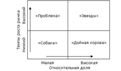 Для оценки конкурентоспособности отдельных видов бизнеса в матрице БКГ используются два критерия: темп роста отраслевого рынка; относительная доля рынка. Темп роста рынка определяется как средневзвешенное значение темпов роста различных сегментов рынка, в которых действует предприятие, или принимается равным темпу роста валового национального продукта. Темпы роста отрасли 10% и более рассматриваются как высокие. Относительная доля рынка определяется делением доли рынка рассматриваемого бизнеса на долю рынка крупнейшего конкурента.