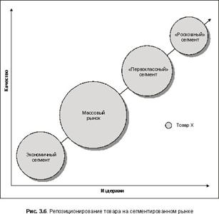 На рис. 3.6. представлена типичная структура рынка, состоящего из четырех сегментов. Позиционирование товара Х неудачно, поскольку издержки производства высоки для массового рынка, а качество не позволяет заинтересовать сегменты потребителей, прежде всего ценящих высокий класс и роскошь. Компания имеет несколько вариантов репозиционирования. Первые две можно назвать (реальным(повторным позиционированием, а последний — психологической стратегией.