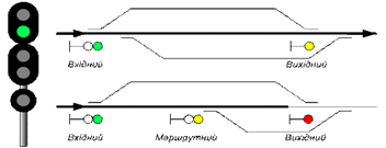 На отдельных станциях в случаях, предусмотренных Правилами технической эксплуатации железных дорог Украины, на входных и маршрутных светофорах может применяться сигнал - три желтые огня - "Разрешается моторвагонному поезду, локомотиву без вагонов (одиночному локомотиву), дрезине несъемного типа следовать на свободный участок пути с особой осторожностью и со скоростью не более 20 км/ч до маршрутного светофора с красным огнем" (рис. 5.11).