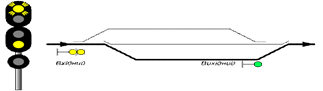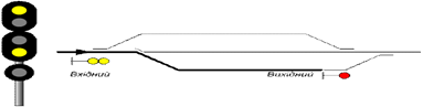 два желтых огня - "Разрешается поезду следовать на станцию с уменьшенной скоростью на боковой путь с готовностью остановиться; следующий светофор закрыт" (рис. 5.5). При приеме на боковой путь, не предназначенный для безостановочного пропуска поездов, показание входного светофора два желтых огня сохраняется независимо от показаний выходного светофора;