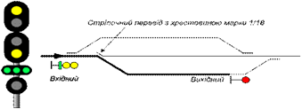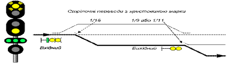 5.1.2. На входных и маршрутных светофорах при приеме поездов на боковые пути по стрелочным переводам с крестовинами пологих марок применяются сигналы: