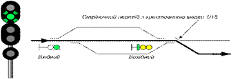 В необходимых случаях на входных и маршрутных светофорах может применяться сигнал - один зеленый мигающий огонь - "Разрешается поезду следовать на станцию по главному пути с установленной скоростью. Следующий светофор (маршрутный или выходной) открыт, поезд следует с отклонением по стрелочному переводу с крестовиной пологой марки" (рис. 5.10).