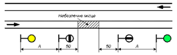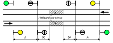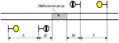 | "А" - расстояние от сигнальных знаков "Начало опасного места" и "Конец опасного места" до сигналов уменьшения скорости; "Б" - расстояние от временных красных сигналов и от места внезапного препятствия, которое возникло, до первой петарды В таблице 6.1 и на всех схемах, которые помещены в данной Инструкции, расстояния представлены в метрах |