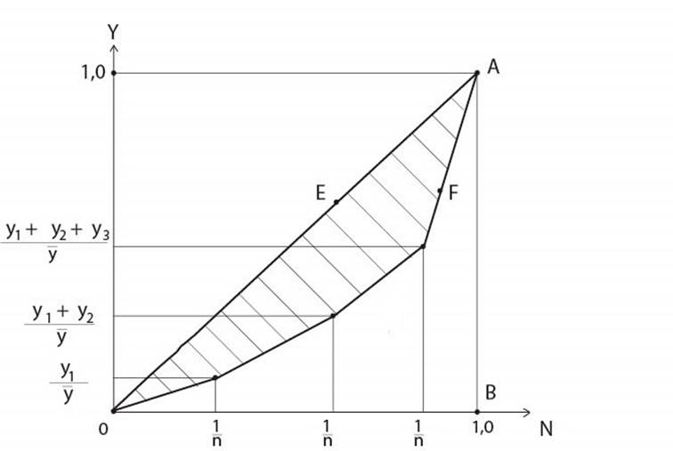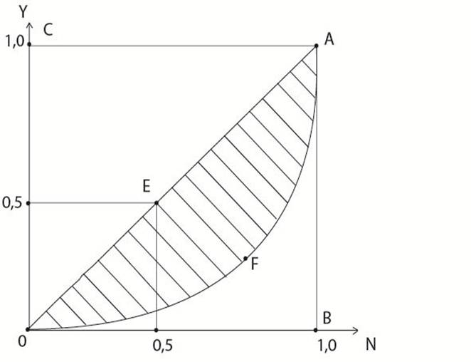 Реальное распределение будет характеризоваться не прямой, а кривой OFA, называемой кривой Лоренца. Если вычислить площадь, образованную прямой ОЕА и кривой ОFА (заштрихованная область), и разделить ее на площадь треугольника ОЕАВ, то получим показатель, измеряющий уровень неравенства и называемый коэффициентом Джини [2] . Чем больше этот коэффициент, тем ближе кривая Лоренса к отрезкам ОВ и АВ, тем сильнее неравенство.