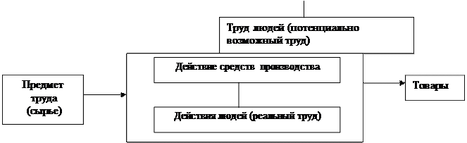 Вступая во взаимодействия все слагаемые производственной системы для выпуска продукта – образуют производственный процесс. Если производственная система есть совокупность некоторых статичных элементов, то производственный процесс есть процесс взаимодействия производственных элементов с целью выпуска продукции. Соотношение между ними, как между двигателем и функционированием двигателя. Смысл создания производственных систем заключается в необходимости реализации производственного процесса. В общем виде производственный процесс – это совокупность действий, необходимых для выпуска продукции. В материальном производстве под производственным процессом понимают совокупность действий людей и оборудования, необходимые на данном предприятии для изготовления или ремонта выпускаемых изделий. Представим схематично производственную систему и производственный процесс (рис. 1 и 2).