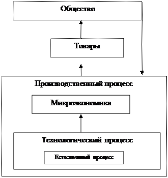 Процесс производства продукта осуществляется в рамках искусственно созданных человеком производственных систем. Любой технологический процесс базируется на каком-то естественном (объективном – физическим, химическим и др.) процессе, который человек изучает, выполняет его законы и закономерности, создает теорию процесса и находит ей применение. То есть человек создает методологию процесса, показывающую последовательность действий (шагов), необходимых для реализации процесса. Методология – программа действий или "теория" – технологии, материализуемая в технологию. Конкретизируется вид сырья, орудия производства (станки, оборудование и т.д.), источник энергии и т.д. Для технологического процесса вырабатывается организация производства, регламентирующая пространственное положение средств производства и время осуществления необходимых действий. При функционировании организованной технологии осуществляется выпуск продукции. При выпуске продукции необходимо выполнять действия экономического характера: снабжение, учет, контроль, управление и т.д. Замыкает логическую цепь общество, которое потребляет товары, причем от уровня потребления зависит уровень развития общества (рис. 5). Следовательно, ни технология ни экономика не функционируют сами по себе, они берут начало в нашем окружении, природе, как и сам человек.