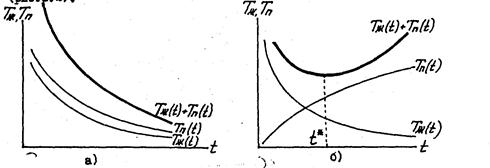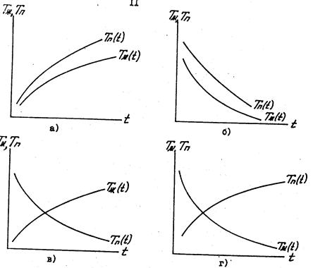 Для определения количественных показателей трудозатрат в реальном технологическом процессе необходимо рассмотреть процесс в динамике (развитии), т.е. в изменении с течением времени удельных затрат живого и прошлого труда, как функции Тж(t) и Тп(t) от времени t. При этом возможныследующие варианты динамики трудовых затрат при развитии технологических процессов (рис. 2):
