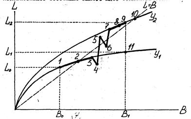 Если мы проведем биссектрису L = В, то она пересечет кривые У1 и У2 соответственно в точках 2 и 10, являющимися границами оптимального рационалистического развития.