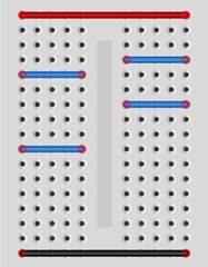 Используемый для курса стенд содержит макетную плату, все верхние контакты которой подключены к пину +5 В Arduino, нижние контакты – к пину Gnd (0 В) Arduino (используются для питания внешних датчиков и модулей), а остальные – соединены вместе по 5 контактов (см. рис.) и могут использоваться для создания различных схем путем втыкания в отверстия макетной платы элементов и проводных соединителей типа штырек/штырек
