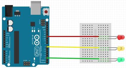 Напишем более сложный алгоритм работы и изменим программу таким образом, чтобы поведение светодиодов было похоже на настоящий светофор