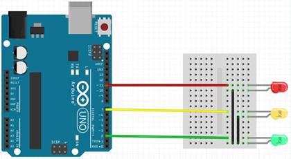 | int led_red = 11; // красный светодиод подключен к пину 11 int led_yellow = 7; // желтый светодиод подключен к пину 7 int led_green = 2; // зеленый светодиод подключен к пину 2 void setup() { // прописываем пины, к которым подключены светодиоды, как выходные pinMode(led_red, OUTPUT); pinMode(led_yellow, OUTPUT); pinMode(led_green, OUTPUT); } void loop() { digitalWrite(led_red, HIGH); // включить красный светодиод delay(1000); // подождать одну секунду digitalWrite(led_red, LOW); // выключить красный светодиод digitalWrite(led_yellow, HIGH); // включить желтый светодиод delay(1000); // подождать одну секунду digitalWrite(led_yellow, LOW); // выключить желтый светодиод digitalWrite(led_green, HIGH); // включить зеленый светодиод delay(1000); // подождать одну секунду digitalWrite(led_green, LOW); // выключить зеленый светодиод } // начать цикл loop снова |