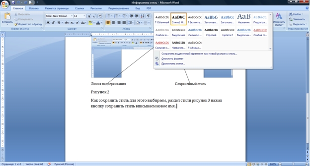 На рисунке 2.2 показаны кнопки линии подчеркивания, и кнопка сохранённого стиля, который теперь можно использовать для написания различных работ, используя сохранённый стиль заголовка.
