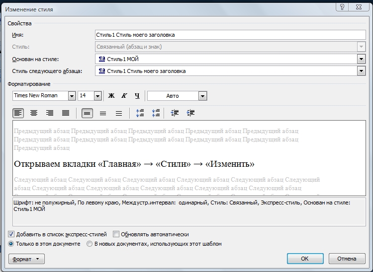 Имя стиля Выравнивание Шрифт Размер шрифта