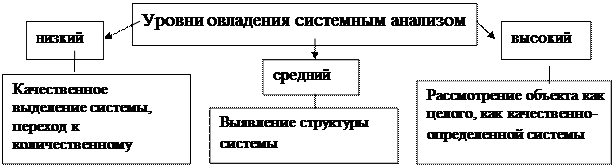 Как провести диагностику системного мышления? Как выделить критерии, показатели и уровни сформированности системного мышления у учащихся? Степень развития системного мышления определяется уровнями его развития, которые, в свою очередь, определяются по степени овладения системным анализом. При этом можно выделить три или более уровня развития системного мышления. Три уровня овладения системным анализом иллюстрируются рис. 3: