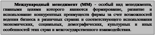 ММ - особый вид менеджмента, главными целями которого является формирование, развитие и использование конкурентных преимуществ фирмы за счет возможностей ведения бизнеса в различных странах и соответствующего использования экономических, социальных, демографических, культурных и других особенностей этих стран и межгосударственного взаимодействия.