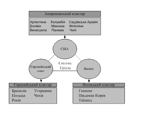 В состав кластеров включены не все страны мира, а лишь те, которые подвергаются наибольшему воздействию кластерных центров. Поэтому если говорить о месте прибалтийских стран или Украины в указанной схеме, то их следовало бы отнести к европейскому кластеру.