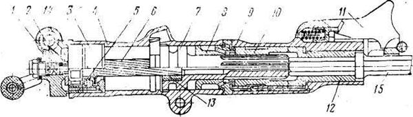 При движении вперед (рабочий ход) поршень-ударник наносит удар по буровому инструменту 15, а при обратном (холостом) ходе поворачивается на некоторый угол вокруг винта 6, поворачивая через буксу 10 и гранбуксу 12 буровой инструмент.