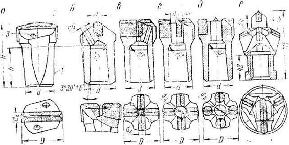Долотчатые коронки (рис. IV.37, а, б) для перфораторного бурения обычно имеют диаметр D, равный 32—65 мм, а крестовые — до 85 мм.