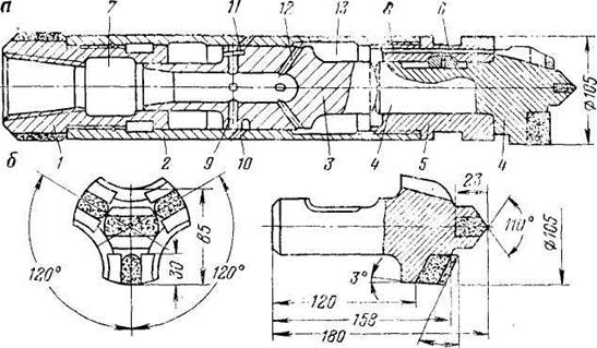 Рис. IV.4). Пневмоударник П1-75 (а) с трехлезвийной буропой коронкой (б)