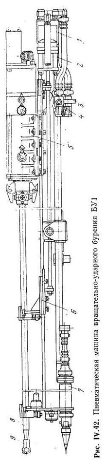Вращательно-ударные машины состоят из следующих основных частей: бурильной головки, механизма подачи, штанги и буровой коронки. Например, бурильная машина БУ1 (рис. IV.42) состоит из пневматического двигателя /, редуктора подачи 2, клапана 3, крана концевого выключателя 4, бурильной головки 5, подвижного люнета 6, распорного домкрата 7, буровой штанги 8 и буровой коронки 9. Бурильная головка 5 перемещается с помощью механизма подачи по направляющей балке и производит бурение шпура на заданную глубину, после чего автоматическим или ручным включением механизма подачи на обратный ход отводится в начальное положение.