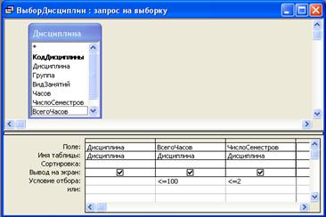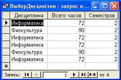 Запрос ВыборДисципин позволяет выбрать дисциплины с общим числом изучения не более 100 и числом семестров изучения не более двух.