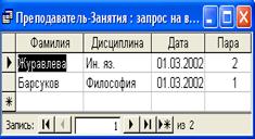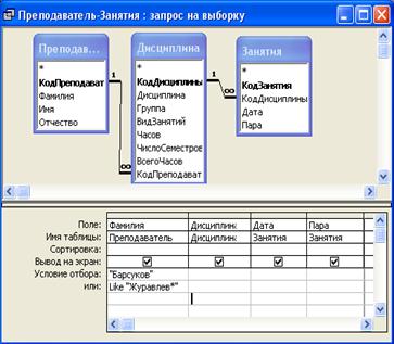 Многотабличный запрос Преподаватель-Занятия, позволяющий получить информацию о занятиях (дисциплина, дата, пара), проведенных преподавателями Барсуковым и Журавлевой, в бланке запросов, представлен на рис. 5.