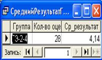 Изменим запрос СреднийРезультатГруппы так, чтобы отобрать группы со средним результатом больше четырех, при этом для вычисления среднего результата будем использовать все оценки. Для отбора нужных групп, зададим условие отбора в поле, где записана статистическая функция группировки Avg (рис. 13).