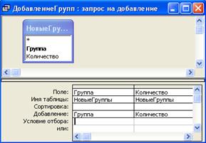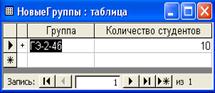 Создадим запрос ДобавлениеГрупп, добавляющий новые группы из таблицы НовыеГруппы в таблицу ГРУППЫ. Естественно, для этого нужно сначала создать таблицу НовыеГруппы (рис. 17).