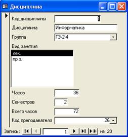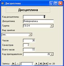 Форма Дисциплины, созданная с помощью мастера (выбран тип формы «в столбец» и стиль оформление «стандартный»), показана на (рис. 20).