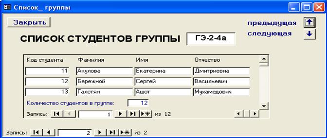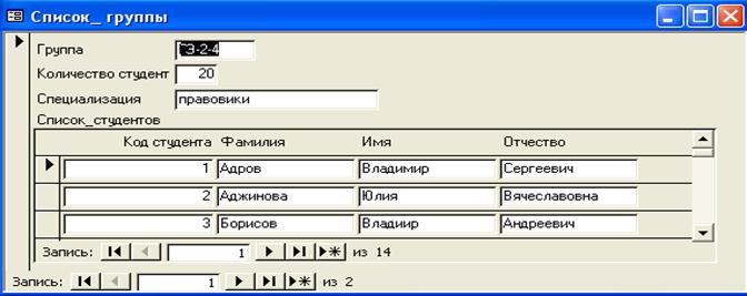 Рассмотрим процесс создания многотабличной формы на примере. Создадим форму Список группы для загрузки данных в таблицы ГРУППА и СТУДЕНТЫ.