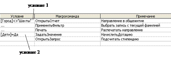 Условие вводится в строку макрокоманды в столбце Условие, вызываемом командой Вид/Условия и задается с помощью логического выражения, например: