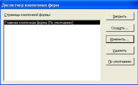 Для этого необходимо выполнить команду Сервис/Служебные программы/Диспетчер кнопочных форм и подтвердить создание кнопочной формы. В появившемся окне диспетчера кнопочных форм (рис. 34) формируется список кнопочных форм разных уровней.