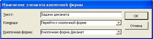В окне Изменение элемента кнопочной формы в строке Текст зададим подпись кнопки «Задачи деканата» (рис.36), в строке Команда выберем Переход к кнопочной форме, в строке Кнопочная форма выберем необходимую форму. Аналогичным образом создадим кнопки вызова двух других подчиненных форм.