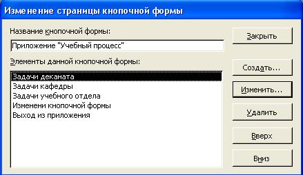 Формирование элементов кнопочной формы. Элементами кнопочных форм являются кнопки с подписями. Подпись задается пользователем и должна по возможности точно называть действия, которые будут выполняться при нажатии кнопки. Для формирования элементов главной кнопочной формы в окне диспетчера выделим соответствующую ей строку и нажмем кнопку Изменить. В окне Изменение страницы кнопочной формы переименуем ее в Приложение «Учебный Процесс» и создадим пять новых элементов (кнопок) – три кнопки для вызова подчиненных кнопочных форм, кнопку для возможности изменения главной кнопочной формы и кнопку для закрытия приложения.