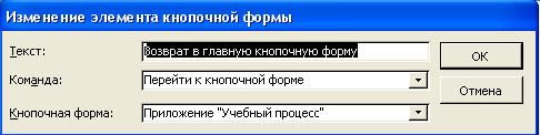 Аналогичным образом в каждой подчиненной кнопочной форме создадим кнопки возврата в главную кнопочную форму, выбрав команду Переход к кнопочной форме, и указав в качестве объекта перехода кнопочную форму Приложение «Учебный процесс» (рис. 38).