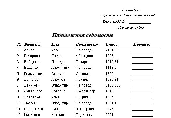 Требования к оформлению: задание оформляется в письменной форме на листах формата А4. Кассовая ведомость распечатывается средствами СУБД. Для определения суммы, выдаваемой на руки, из начисленной заработной платы вычитается подоходный налог (13%). База данных на дискете прилагается к заданию.