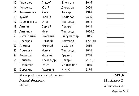 | 2.4. Создание отчета | Основные сведения об отчетах. Описание процесса создания отчета для распечатки ведомости заработной платы. В раздел помещается отчет, распечатанный из БД. |