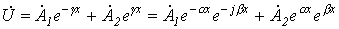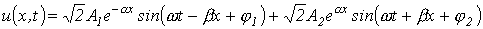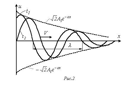 Слагаемые в правой части соотношения (7) можно трактовать как бегущие волны: первая движется и затухает в направлении возрастания х, вторая – убывания. Действительно, в фиксированный момент времени каждое из слагаемых представляет собой затухающую (вследствие потерь энергии) гармоническую функцию координаты х, а в фиксированной точке – синусоидальную функцию времени.