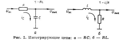 Произведение RС=t, характеризующее скорость заряда конденсатора, наз. постоянной времени И. ц. Широко используется простейшая RC-И. ц. (рис. 2, а). В этой схеме ток заряда конденсатора определяется разностью входного и выходного напряжений [iC=(Uвх-Uвых)/R] поэтому интегрирование входного напряжения выполняется приближённо и тем точнее, чем меньше выходное напряжение по сравнению с входным. Последнее условие выполняется, если постоянная времени t много больше интервала времени, по к-рому происходит интегрирование. Для правильного интегрирования импульсного входного сигнала необходимо, чтобы t была много больше длительности импульса Т (рис. 3). Аналогичными свойствами обладает RL-И. ц., показанная на рис. 2, б, для к-рой постоянная времени равна L/R.