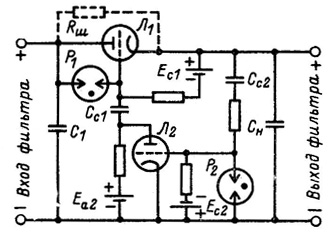 На выходе источника постоянного напряжения (выпрямителя), обладающего внутренним сопротивлением R в, включен электронный фильтр, состоящий из ламп Л 1, Л 2, конденсаторов С с1, С с2, С 1, С н и резисторов.