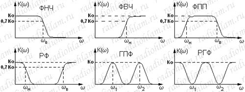 По характеру полосы пропускаемых частот фильтры делятся на шесть типов: