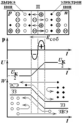 Этот процесс подобен диффузии свободных электронов из полупроводника n-типа в полупроводник р-типа и диффузии дырок в противоположном направлении. В результате ухода основных носителей заряда на границе разнотипных полупроводников создается обедненный подвижными носителями слой, в котором в n-области будут находиться положительные ионы донорных атомов; а в p- области - отрицательные ионы акцепторных атомов. Этот обедненный подвижными носителями слой протяженностью в доли микрона и является электронно-дырочным переходом.