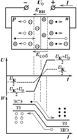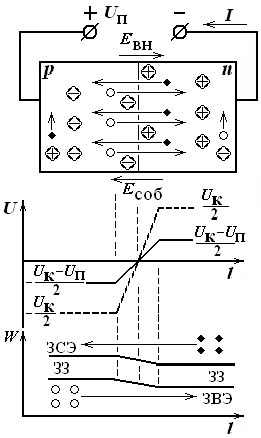 | Если к кристаллу полупроводника приложить внешнее напряжение (рис.2), то оно падает на p – n переходе – обедненном свободными носителями заряда слое полупроводника, имеющего большое сопротивление. Полярность U П противоположна собственному потенциалу перехода U К. Прямое внешнее напряжение U П создает в переходе электрическое поле E ВН, направленное навстречу Е СОБ. Поэтому энергетический барьер перехода снижается, и все основные носители заряда проходят через p – n переход, сопротивление которого уменьшается. Ток I ОБР не изменится, он зависит от температуры и других внешних воздействий, а I ПР возрастет. При большом прямом токе I ПР.МАКС на кристалле полупроводника рассеивается большая активная мощность P МАКС, что ведет к его термическому разрушению. К кристаллу полупроводника приложим внешнее обратное напряжение U О, полярность которого совпадает с потенциалом перехода U К. | Рис. 2 Прямое смещение p – n перехода |
