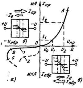 Она состоит из прямой (OА) и обратной (ОВС) ветвей; на вертикальной оси отложены значения прямого и обратного тока, а на оси абсцисс — значения прямого и обратного напряжения.