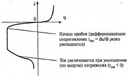 Характерной особенностью этого изменения является резкое уменьшение дифференциального сопротивления перехода (Rдиф). Соответствующий участок вольт-амперной характеристики изображен на рисунке слева (обратная ветвь). После начала пробоя незначительное увеличение обратного напряжения сопровождается резким увеличением обратного тока. В процессе пробоя ток может увеличиваться при неизменном и даже уменьшающемся (по модулю) обратном напряжении (в последнем случае дифференциальное сопротивление Rдиф оказывается отрицательным).