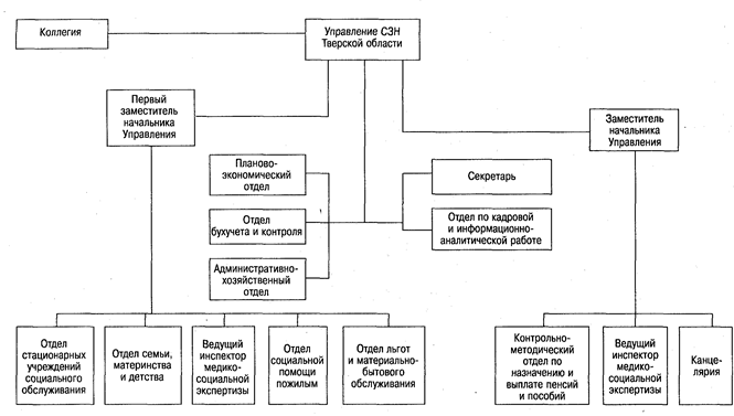 Управление социальной защиты населения является структурным подразделением администрации Тверской области, осуществляющим государственную политику Российской Федерации в области социальной защиты пенсионеров, инвалидов, материнства и младенчества, семей с несовершеннолетними детьми, а также нуждающихся в государственной поддержке групп населения (см. схему 6).